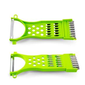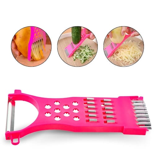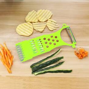 Um ralador de legumes multifuncional, versátil, projetado para facilitar o preparo de diversos alimentos. Ele combina várias funções em um único dispositivo, oferecendo praticidade e economia de espaço, sendo indispensável na cozinha Com seu tamanho compacto e 4 lâminas, composto para auxiliar na praticidade de cozinhar no dia a dia, dentre suas lâminas, as funções delas são: Lâmina para descascar; Círculos com relevo plástico para ralar ingredientes como alho; Duas fileiras de lâminas retangulares para ralar; Lâmina ondulada para realizar cortes.