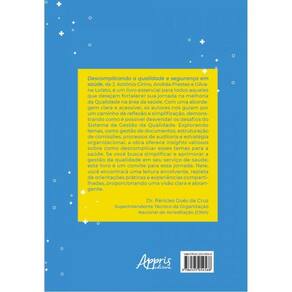 Descomplicando a qualidade e segurança em saúde, de J. Antônio Cirino, Andréa Prestes e Gilvane Lolato, é um livro essencial para todos aqueles que desejam fortalecer sua jornada na melhoria da Qualidade na área da saúde. Com uma abordagem clara e acessível, os autores nos guiam por um caminho de reflexão e simplificação, demonstrando como é possível desvendar os desafios do Sistema de Gestão da Qualidade. Explorando temas, como gestão de documentos, estruturação de comissões, processos de auditoria e estratégia organizacional, a obra oferece insights valiosos sobre como descomplicar esses temas para a saúde. Se você busca simplificar e aprimorar a gestão da qualidade em seu serviço de saúde, este livro é um convite para essa jornada. Nele, você encontrará uma leitura envolvente, repleta de orientações práticas e experiências compartilhadas, proporcionando uma visão clara e abrangente. Dr. Péricles Goés da Cruz Superintendente Técnico da Organização Nacional de Acreditação (ONA).