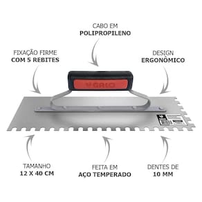 Com dentes de 10x10mm, esta desempenadeira é indicada para aplicação de argamassas, permitindo um excelente assentamento de cerâmicas, porcelanatos, pastilhas, mármores e outros tipos de pedras. O produto é confeccionado com uma base robusta, fixada por 5 rebites, assegurando que a ferramenta mantenha sua integridade mesmo em condições de trabalho intenso.