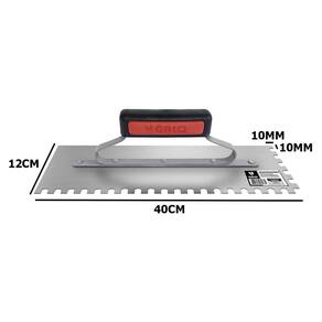 Benefícios: - Alta durabilidade graças ao aço temperado. - Cabo ergonômico que oferece melhor controle e segurança. - Base dentada que permite uma distribuição uniforme da argamassa.