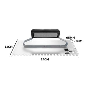 O tamanho da desempenadeira é de 12x29 cm, ideal para trabalhos em áreas médias e grandes.