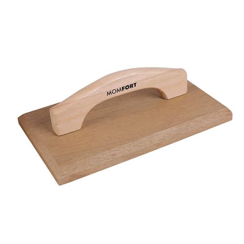 USO: Tradicional, a desempenadeira de madeira é utilizada para aplicar, nivelar e uniformizar a argamassa de revestimentos e contrapisos. A madeira concentra umidade o que auxilia na aplicação da massa.