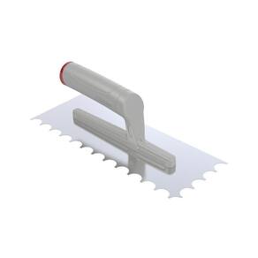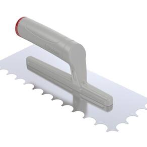 As desempenadeiras de aço dentadas R-10 são ferramentas ideais para criar sulcos e cordões para aplicação de argamassa para assentamento de revestimentos cerâmicos cerâmicas, porcelanatos de grandes formatos placas com área superficial acima de 900 cm . Dispensa o uso de dupla camada aplicação da argamassa no verso da placa e no contrapiso . Ean: 7897451421729