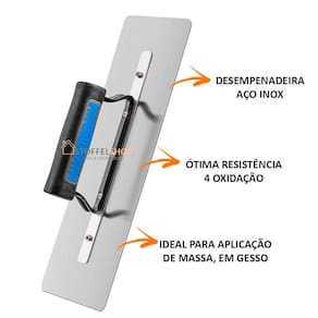 DESCRIÇÃO DO PRODUTO:DESEMPENADEIRA DE AÇO INOX COM CANTOS REDONDOS 12X35CM. CABO FECHADO COM REFORÇO.INDICAÇÃO DE USO:IDEAL PARA APLICAÇÃO DE MASSA, TRABALHOS EM GESSO. OTIMA RESISTENCIA A OXIDAÇÃO.