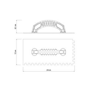 Para um melhor acabamento do seu projeto, a Desempenadeira Lisa com Dentes Tramontina em Aço com Acabamento Zincado e Cabo de Polipropileno é a companheira certa. Ideal para auxiliar você nas tarefas de construção ou reforma, ela é produzida em aço carbono especial. Garantindo alta qualidade, possui superfície polida e acabamento zincado. Para o melhor assentamento de lajotas e azulejos, ela apresenta dentes que são utilizados para formar sulcos na massa. Além disso, possui cabo em polipropileno com ranhuras e formato ergonômico, tornando a experiência para o usuário ainda mais confortável. - Fabricada em aço carbono especial de alta qualidade.- Possui superfície polida e acabamento zincado.- Possui dentes que são utilizados para formar sulcos na massa, para assentamento de lajotas e azulejos.- Cabo produzido em polipropileno de alta resistência.- O cabo possui ranhuras e tem formato ergonômico, assegurando mais conforto durante o uso. Observações - A desempenadeira é utilizada na construção civil para aplicar, nivelar e espalhar uniformemente a argamassa para revestimentos.Os dentes são utilizados para formar sulcos na massa, para assentamento de lajotas e azulejos.- Para descarte dos produtos e embalagens siga as orientações de reciclagem vigentes. Características Gerais EAN13 7891117092674 DUN14 17891117092671 NCM 8205.59.00 Peso Líquido 0,1620 kg. Peso Bruto 0,1820 kg. Metragem 0,001200 m³. Dimensões Embalagem (Compr. X Larg. X Alt.) 240x 120x 60 mm. Dimensões Produto (Compr. X Larg. X Alt.) 240x 120x 61 mm. Cor 1 A9A9A9 Hexa