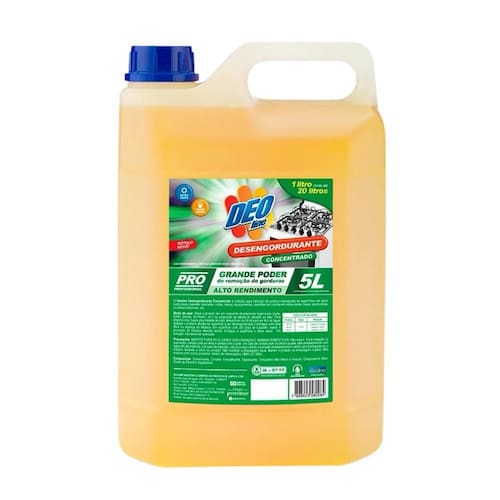 Desengordurante Concentrado Remoção de Gorduras Deoline Volume: 5 Litros Desengordurante Concentrado Deoline 5 Litros O Deoline Desengordurante Concentrado é a solução ideal para a remoção eficaz de gorduras impregnadas em diversas superfícies. Com alto poder de desengordurante, é especialmente indicado para limpeza pesada de pisos, paredes, bancadas, coifas, mesas, equipamentos e utensílios de cozinha, tanto em ambientes domésticos quanto industriais. Sua fórmula concentrada proporciona um excelente desempenho na remoção das gorduras mais difíceis, garantindo um ambiente limpo e higienizado. Características principais: Produto desengordurante concentrado de alta performance Ideal para limpeza de pisos, paredes, bancadas, coifas, mesas e utensílios de cozinha Indicado para cozinhas domésticas e industriais, restaurantes, bares, lanchonetes, entre outros Remove até as gorduras mais difíceis Produto concentrado, garantindo maior economia Indicações e modo de uso: Campo de aplicação: Pode ser em cozinhas profissionais e domésticas Modo de uso: Dilua o produto conforme a tabela de diluição abaixo Para limpeza leve, use 45 ml para 1 litro de água Para limpeza geral, use 90 ml para 1 litro de água Para limpeza pesada, use 180 ml para 1 litro de água Aplique o produto diluído na superfície a ser desengordurada e esfregue com uma esponja de limpeza Enxágue bem a superfície e deixe secar Não estocar solução diluída Tabela de Diluição: Limpeza Leve: 45 ml para 1 litro de água Limpeza Geral: 90 ml para 1 litro de água Limpeza Pesada: 180 ml para 1 litro de água Informações do produto: Volume: 5 Litros Código interno: 90201 - 5L Aplicação: Remoção de gordura impregnada de superfícies em geral Marca: Não Informado
