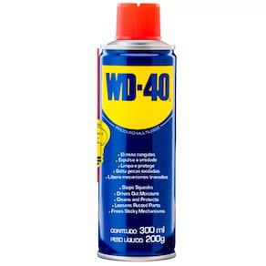 WD-40 Produto Multiusos elimina rangidos, expele a umidade, limpa e protege, solta peças oxidadas e libera mecanismos travados. A emblagem prática de 300ml e 200g aerossol tem um formato que facilita o seu manuseio. Mais fina e mais alta, é mais fácil de pegar! Ideal para usar em casa, no trabalho, no carro, etc. Também possui válvula 180º exclusiva que permite o uso com a lata de cabeça para baixo.