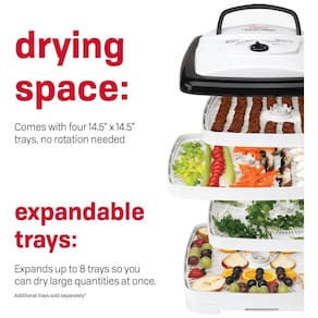 Embalagem do produto Embalagem padrão O NESCO FD 80 Food and Jerky Dehydrator é perfeito para produzir espasmódicos e ervas secas, frutas e legumes. O controle de temperatura ajustável 35 C a 71,1 C oferece a flexibilidade de obter os melhores resultados ao secar diferentes alimentos que precisam de configurações de temperatura variadas. Este desidratador é fornecido com 4 bandejas quadradas 36,83 x 36, e expande até 8 bandejas, para que você possa secar grandes quantidades, sem necessidade de rotação da bandeja. Bandejas Add A adicionais vendidas separadamente. O silencioso e potente ventilador Converga Flow força o ar aquecido pela câmara pressurizada externa e depois horizontalmente em cada bandeja individual. O fluxo de ar converge no centro para uma secagem rápida e consistente quatro vezes mais rápida que outros desidratadores. O tempero e a cura da amostra estão incluídos para começar. O NESCO FD 80 Food and Jerky Dehydrator fornece o poder de secagem para desidratar grandes petiscos espasmódicos e de frutas para o estilo de vida ativo.