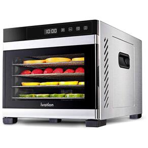 VENTILADOR AUTOMÁTICO TRASEIRO O ventilador dentro deste desidratador circula ar quente com 600W de potência de aquecimento para garantir que seu produto alimentar seja sempre seco de todos os ângulos. SEIS BANDEJAS ESPAÇOSAS espaço para seis bandejas 13 X 12 significa que você tem espaço para preservar todo o seu espaço favorito de carne, frutas, petiscos, legumes, pão, ervas, guloseimas para cães e muito mais, para obter benefícios de saúde superiores duradouros Você pode remover uma ou mais bandejas de cada vez para abrir o espaço para fatias especialmente grossas, se necessário. CORPO E BANDEJA DE AÇO INOXIDÁVEL Todas as peças são isentas de BPA, tornando as como segurança para uso doméstico e e mantendo sua comida livre de toxinas prejudiciais. TEMPERATURA DIGITAL E TEMPORIZADOR possui uma faixa de temperatura de 30 a 70 graus. Defina ou temporizador para desligar automaticamente o desidratador no horário designado, em incrementos de 30 minutos, por até 24 horas por vez. FÁCIL DE LIMPAR como bandejas de aço inoxidável e uma bandeja de parte inferior da unidade são todas removíveis, segurança para máquina de lavar louça e limpeza de sua conveniência. Especificações Está em conformidade com as normas de segurança elétrica dos EUA ETL Dimensões 17,75 x 13,37 x 12,25 polegadas Potência nominal 600W Conteúdo da caixa Desidratador de alimentos 6 racks de secagem 1 folha de malha 1 folha seca Bandeja de ferramentas Guia do usuário Ivation Desidratador de alimentos em aço inoxidável de 6 bandejas O aço inoxidável da Ivation