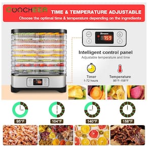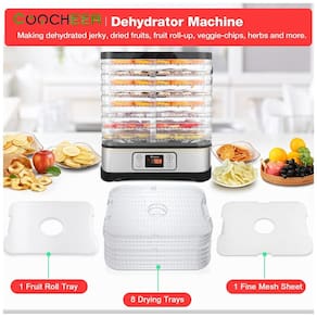 Atualizado 8 bandejas e 400 watts mais espaço de secagem e seque rapidamente Desidratador com temporizador tempo de 72 horas para tempo e temperatura de secagem precisos escolha temperaturas de secagem entre 35 e 70 graus Configurações de temperatura digital LCD fácil de assistir, o ajuste preciso da temperatura permite secar diferentes tipos de comida com perfeição. Batatas fritas de banana, maçã, vegetais desidratados e até mesmo suas próprias misturas caseiras de sopa seca. Tudo nítido e seco para a perfeição total. Não é necessária rotação o ventilador montado no fundo e o elemento de aquecimento fornecem fluxo de ar consistente para uma secagem ideal. Duas maneiras de colocar e tamanhos diferentes Gire as bandejas de alimentos em 180 graus para obter alturas diferentes, e 1, Tamanho compacto aparência quadrada da moda As dimensões são 14 12 10 ines, fáceis de zenar Desidratador de alimentos multifuncional, faça o que você quiser com os salgadinhos de frutas Jerky. Capacidade Extensível Cinco bandejas empilháveis, grande capacidade flexível e extensível.