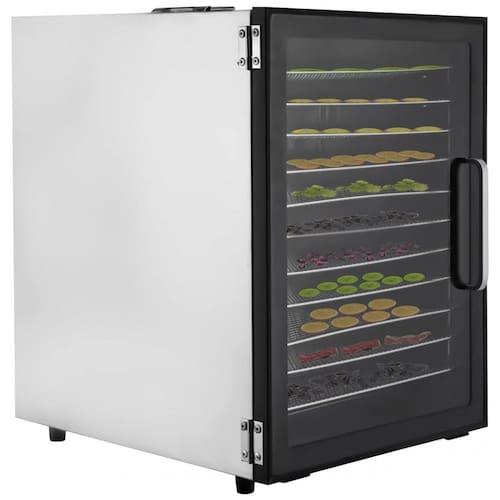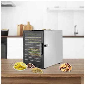 Possui 10 bandejas, cada uma com tamanho de 29 x 29 centímetros, oferecendo excelente espaço de expansão para secar vários alimentos ao mesmo tempo. Com 800 watts de potência, este desidratador alcança o efeito de secagem desejado em menos tempo, tornando o eficiente e econômico em termos de energia. Utiliza uma porta frontal de vidro e uma luz LED embutida, permitindo acompanhar o andamento do processo de secagem e identificar mudanças sutis na secagem dos alimentos. A operação estável do sistema de fluxo de ar horizontal mantém o nível de ruído abaixo de 48 decibéis, garantindo que você não será perturbado por ruídos altos ao secar lanches caseiros. Na parte frontal da máquina, há um painel de controle LED transparente. Basta conectar a energia, pressionar o botão de ligar, desligar e configurar o tempo e a temperatura para iniciar o processo de secagem.