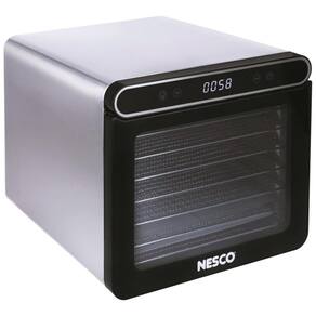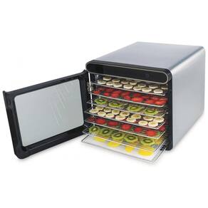 DISTRIBUIÇÃO UNIFORME DE CALOR: Com 600 watts de potência de secagem e um grande ventilador, proporciona uma distribuição uniforme de calor para máxima velocidade e qualidade na desidratação dos alimentos. CONTROLE DE TEMPERATURA: O painel de controle intuitivo possui um display digital de tempo e temperatura com tempo ajustável 1 24 horas e controle de temperatura 90 160F para facilitar o processo de desidratação. VISUALIZAÇÃO CLARA DA JANELA: Possui uma grande janela de visualização e uma luz interna para facilitar a visualização, tudo isso em um elegante gabinete de aço inoxidável. BANDEJAS DE AÇO INOXIDÁVEL: Vem com 7 bandejas livres de BPA que podem ser lavadas na máquina de lavar louça 30 a 27 centímetros para que você possa desidratar uma quantidade maior de alimentos de uma vez. FÁCIL DE USAR: O interior é todo em metal, o que facilita a limpeza e garante a máxima retenção de calor ao preparar carne seca, couro de frutas, frutas secas, petiscos para cães e muito mais. ACESSÓRIOS INCLUÍDOS: Inclui 1 folha de malha de plástico para itens pequenos, como ervas, e 1 bandeja coletora de plástico que pode ser usada como folha de rolo de frutas ou para secar molhos.
