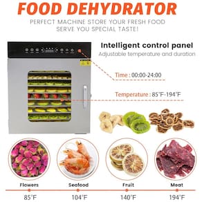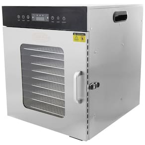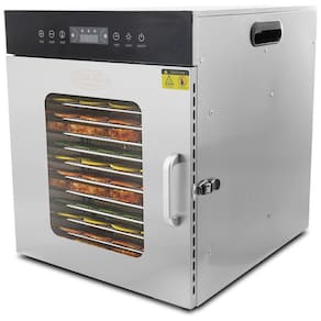 Ótimo para desidratar frutas, ervas, carne bovina, espasmódica, couros de frutas e muito mais. Inclui racks cromados removíveis 27 x para alta capacidade e fácil limpeza. Faixa de temperatura ajustável 30 a 90 C e temporizador de 24 horas para precisão. A construção atraente e durável em aço inoxidável é perfeita para cozinhas comerciais. Facilita a adição e remoção de bandejas. ACESSÓRIOS Inclui uma bandeja de tela poli flexível para impedir que os alimentos grudem e as bandejas não precisam ser movidas ou giradas durante a operação. Inclui o Guia de Desidratação
