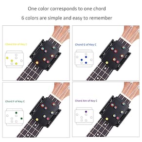 -?Tocar confortavelmente?O design do botão redondo elimina a dor nos dedos ao pressionar as cordas, tornando o toque mais relaxante. Além disso, o sistema de seis cores facilita lembrar qual acorde é qual, as 6 cores são simples e fáceis de lembrar, para que você possa se concentrar no posicionamento da mão sem distrações.