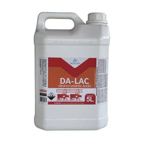 DA-LAC é um eficiente desincrustante, de caráter ácido, não espumante. Produto formulado especialmente para limpeza de equipamentos de aço inoxidável de circuitos fechados (C.I.P) na indústria de alimentos. Promovendo a remoção a fundo de calcificações de sais de cálcio e magnésio provenientes da água dura e pedra do leite formada por depósitos de sais minerais, proteínas e óxidos de leite.