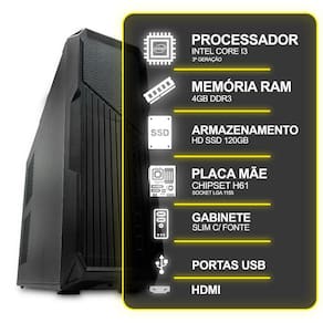 O Computador Desktop Slim, Intel Core I3 3º Ger, 4Gb Ram, Hd Ssd 120Gb é perfeito tanto para uso doméstico quanto corporativo. Adaptável a qualquer ambiente, ele atende suas necessidades de trabalho e lazer.