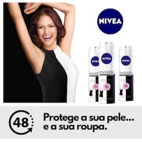 O Desodorante Aerosol Nivea Invisible Black e White 150ml proporciona 48 horas de proteção, elimina 99% das bactérias causadoras do mal odor, evita manchas amarelas nas roupas brancas causadas pela transpiração.