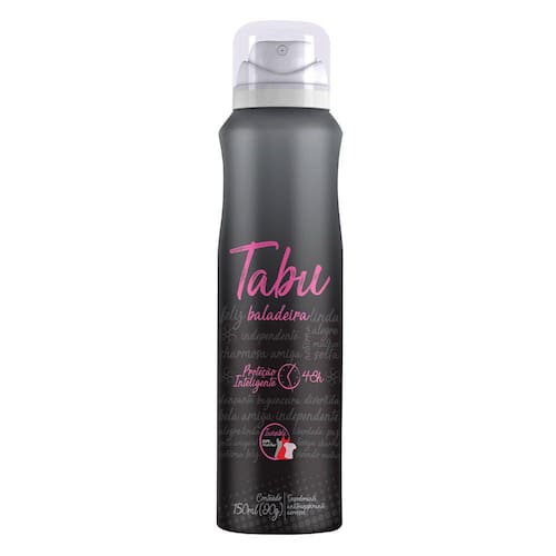 O Desodorante Aerosol Tabu Collection Baladeira foi desenvolvido com uma fórmula que hidrata e prolonga a proteção contra odores nas axilas durante muito tempo. Ideal para manter as axilas protegidas, sem odor e com uma sensação de frescor. Tabu Baladeira chega para complementar a linha Tabu, que já possui produtos caracterizados com a essência da menina- mulher brasileira: lindas, livres, delicadas e ousadas. Para ousar a noite toda, quebrar regras e conquistar o mundo, a nova fragrância traz em sua composição uma associação de cítricos borbulhantes com a sofisticação da cereja e do damasco rosa.