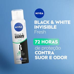 NIVEA Desodorante Aerossol Black & White INVISIBLE Fresh Erva-doce proporciona a melhor proteção contra manchas e suor. Sua fórmula é 5x anti odor, suor, manchas, resíduos nas roupas e irritação na pele, com proteção prolongada de 72 horas. Evita manchas brancas em roupas pretas e manchas amarelas em roupas brancas.