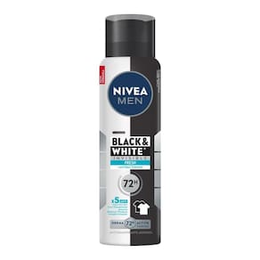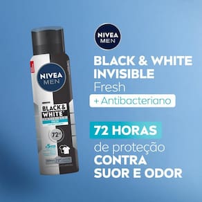 NIVEA MEN Desodorante Aerossol Black & White INVISIBLE Fresh proporciona a melhor proteção contra manchas e suor. Sua fórmula é 5x anti odor, suor, manchas, resíduos nas roupas e irritação na pele, com proteção prolongada de 72 horas e antibacteriano. Evita manchas brancas em roupas pretas e manchas amarelas em roupas brancas.