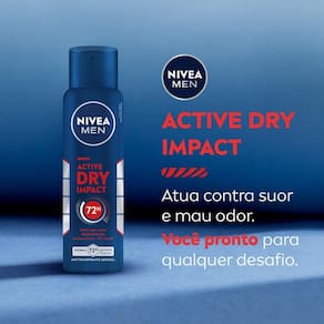 - NIVEA MEN Desodorante Antitranspirante Aerossol Active Dry Impact oferece proteção eficaz por 72 horas contra suor e mau odor, proporcionando sensação de pele seca e confortável. Dermatologicamente testado, é ideal para todos os tipos de pele.