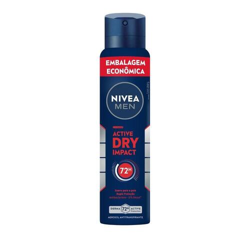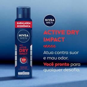 NIVEA MEN Desodorante Antitranspirante Aerossol Active Dry Impact é um desodorante masculino desenvolvido para oferecer proteção duradoura contra o suor e mau odor. Ele garante sensação de pele seca por até 72 horas, além de ser dermatologicamente testado para oferecer conforto e proteção para a pele.