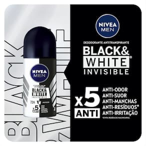 Desodorante Antitranspirante Roll-on Nivea Men Invisible Black & White O que é? Desodorante roll on que refresca, protege por 48h e evita manchas nas roupas. Você livre de manchas, suor e mau odor. Confira! Para que serve o Desodorante Roll On Nivea Men Invisible Black & White? Poderosa fórmula elimina 99,9% das bactérias e evita manchas brancas em roupas pretas e manchas amarelas em roupas brancas. Benefícios e diferenciais - A melhor proteção contra manchas e suor - 2x mais agentes antitranspirantes e minerais - Sem álcool etílico e corantes Como usar o Desodorante Roll On Nivea Men Invisible Black & White? Agite bem antes de usar. Ao aplicar o produto, mantenha o frasco a aprox. 15 cm da axila. Espere secar antes de se vestir. Uma unidade de embalagem contém 50ml