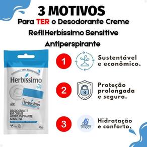 Perfeito para o uso diário, Herbíssimo Refil Sensitive é a escolha ideal para quem busca proteção duradoura e cuidado especial para as axilas, seja na rotina de trabalho, atividades físicas ou momentos de lazer. Sua fórmula suave é especialmente indicada para pessoas com peles sensíveis que necessitam de hidratação e proteção contínua. Ideal para usar após a depilação, em viagens ou em qualquer situação que exija proteção extra e conforto.
