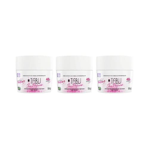 O Creme Desodorante Antiperspirante Tabu possui uma fórmula especialmente desenvolvida com glicerina vegetal e óleo de girassol, que promovem a hidratação das axilas por até 24 horas. Evita o ressecamento da pele e ajuda a mantê-la macia e hidratada. Minimiza possíveis irritações na pele. 48 horas de proteção contra a transpiração e o odor. Dermatologicamente testado, não contém álcool etílico e nem corantes. Conteúdo: 55g.