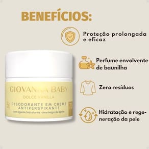 Sinta-se protegida, perfumada e hidratada todos os dias com o toque delicado e acolhedor da fragrância Dolce Vanilla, da tradicional linha Giovanna Baby. O Desodorante em Creme Giovanna Baby Dolce Vanilla oferece uma experiência completa de cuidado pessoal, unindo a eficácia do antitranspirante com uma fragrância envolvente e textura hidratante. Ideal para quem busca proteção prolongada com conforto e sofisticação.