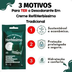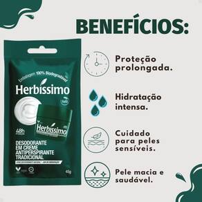 Desodorante Em Creme Refil Herbíssimo Tradicional Antiperspirante 45g Garanta proteção eficaz e duradoura contra o suor e o mau odor com o Desodorante Em Creme Refil Herbíssimo Tradicional Antiperspirante 45g. Desenvolvido pela tradicional marca HERBISSIMO, este refil é a escolha inteligente para quem busca economia sem abrir mão da qualidade e do cuidado com o meio ambiente. Sinta a confiança de estar protegido o dia todo, com uma fórmula suave que hidrata a pele e evita irritações. Ideal para homens e mulheres que prezam por praticidade e bem-estar, este refil é perfeito para manter a sua rotina de higiene pessoal em dia, com a vantagem de um produto sustentável e econômico.