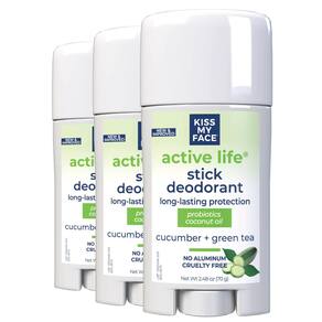O desodorante Kiss My Face Active Life contém ingredientes de origem natural, controle de odor de 72 horas | Para mulheres e homens, sem alumínio com óleo de coco e probióticos, aroma de pepino e chá verde, pacote com 3