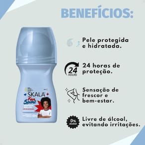 O Desodorante Roll-on Infantil Skala Fun Sport é perfeito para o uso diário, acompanhando as crianças em suas atividades escolares, brincadeiras e práticas esportivas.