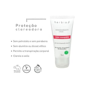 Desodorante Rosa Mosqueta Em Creme Clareador 50ml Herbia O Desodorante Rosa Mosqueta em Creme Clareador 50ml da Herbia é formulado com ingredientes de origem vegetal e textura cremosa, pensado para integrar uma rotina de cuidados mais consciente. Contém óleo de rosa mosqueta e outros extratos naturais, conhecidos por suas propriedades suavizantes. Sua aplicação é prática e confortável, sendo livre de substâncias sintéticas agressivas. Ideal para quem busca uma alternativa delicada no cuidado diário com as axilas. Marca: Não Informado