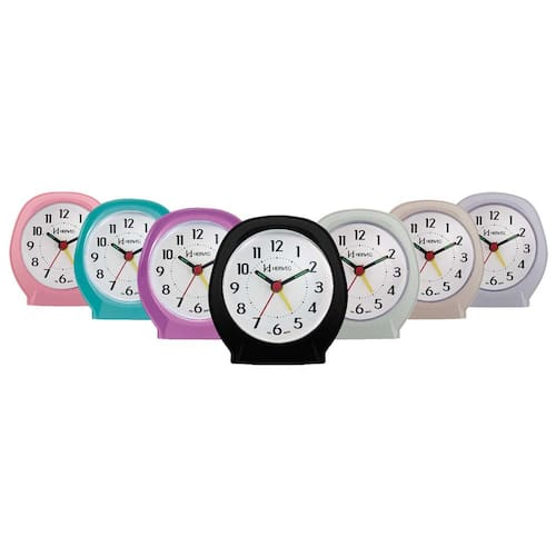 Relógio Despertador Herweg 2634-007 Tamanho: 9cm de altura X 8cm de largura X 6cm de espessura Maquinário: Step Tic-tac Cor do fundo: Branco Cor da Estrutura: Azul Baby Base: Plástico injetado Vidro: Acrílico Usa pilha AA Ponteiros com massa luminosa Fosforescente Alarme sonoro Fabricado por HERWEG RELÓGIOS com de 1 Ano Marca: Não Informado