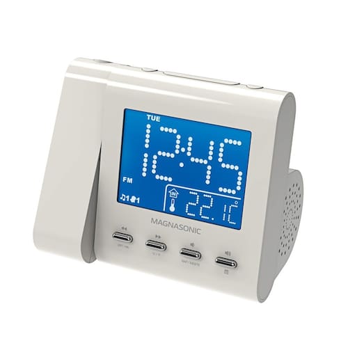 Conveniência, confiabilidade e design moderno vêm na forma do despertador de projeção EAAC601 da Magnasonic. Este rádio relógio avançado define automaticamente a hora e a data e salva todas as configurações de alarme quando a energia acaba. Além disso, com exibição de projeção de tempo, alarmes duplos, exibição de temperatura, um grande LCD retroiluminado com opções de escurecimento e a capacidade de reproduzir música do seu smartphone, tablet ou leitor de MP3, este é o único despertador que você vai precisar.