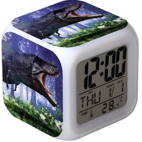 Material: plástico Tamanho: 8* 8* 8 cm Peso: 140 g Design divertido de dinossauro: com uma imagem vibrante de dinossauro em todos os lados, este despertador LED em forma de cubo é perfeito para amantes de dinossauros e adiciona um toque divertido ao quarto de qualquer criança. Display LED colorido: O relógio possui um display LED colorido e atraente que mostra hora, data e temperatura, tornando-o funcional e visualmente atraente para crianças. Display digital com fácil legibilidade: o display digital nítido mostra a hora, o dia, o mês e a temperatura em números grandes e fáceis de ler, perfeitos para crianças que aprendem a contar as horas. Compacto e adequado para crianças: com um design pequeno em forma de cubo, este relógio é fácil de colocar em mesinhas de cabeceira ou mesas, tornando-o ideal para quartos infantis ou salas de jogos. Perfeito para quartos de crianças: seu design exclusivo de dinossauro de desenho animado e cores brilhantes tornam este relógio uma excelente adição ao quarto de uma criança, despertando sua imaginação e mantendo-a na hora certa.