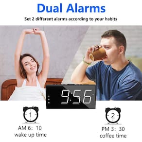 - ? DESPERTADOR DUPLO: Este Um com funções práticas suficientes para uso diário: volume de alarme ajustável de 4 níveis, dimmer de brilho de 5 dígitos, porta de carregamento USB embutida, função SNOOZE para dormir mais 9 minutos, tomada operada com configurações de backup de bateria, função 12/24H e DST também disponível.