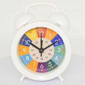 Material: ABS+componentes eletrônicos+PP+vidro Tamanho: 8,5* 4* 11 cm Peso: 84 g Design vibrante e colorido: este despertador apresenta um design brilhante e multicolorido que não só o torna visualmente atraente, mas também ajuda as crianças a aprender a reconhecer números de uma forma divertida e interativa. Alarme Twin Bell: Equipado com sinos duplos, este relógio fornece um som alto e claro para garantir que as crianças acordem na hora certa, tornando-o perfeito para as manhãs escolares. Construção de plástico durável: feito de materiais ABS e PP de alta qualidade, este relógio é leve e resistente, garantindo que ele possa suportar o uso diário por crianças. Movimento de quartzo sem tique-taque: o mecanismo silencioso e antiaderente permite um sono tranquilo, tornando-o ideal para pessoas com sono leve e criando um ambiente calmo para crianças. Perfeito para aprender: os recursos educacionais do relógio, incluindo números claros e fáceis de ler, o tornam uma excelente ferramenta para ensinar as crianças a contar as horas e, ao mesmo tempo, servir como um despertador confiável.