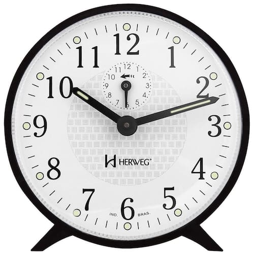 Despertador mecânico - 2220-34 Marca: herweg Cor: preto Formato: redondo Estilo: clássico Relógio despertador mecânico a cordas Base em plástico injetado Visor de acrílico Ponteiro com massa luminosa noturna Mostrador com massa luminosa noturna Botões de regulagem na parte traseira Características técnicas: Alarme com som campainha Funcionamento mecânico Medidas: Altura do relógio: 10,5 cm Largura do relógio: 10,5 cm Espessura do relógio: 4,2 cm com botões traseiros 5,0 cm O despertador acompanha: Manual de instrução Certificado de de 12 meses Embalagem Marca: Não Informado
