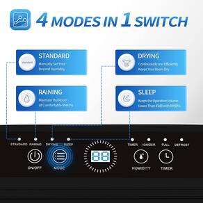 2. Este desumidificador de porão para salas pequenas ou grandes possui seu controle inteligente de umidade com simplesmente vários modos e funções. Basta pressionar o botão MODE para escolher o PADRÃO para personalizar o nível de umidade ou alternar para os outros três modos para necessidades especiais de desumidificação. Além disso, a função de temporizador bidirecional permite que você predefina a hora para início e parada automáticos. Vários botões oferecem um controle mais flexível!