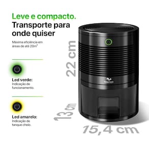 - Desumidificação (l/dia): até 250ml por dia. Para atingir o máximo de desumidificação por dia (250ml) o ambiente deve ser menor que 20m², estar a 30°C e com o nível de umidade inicial em 80%.