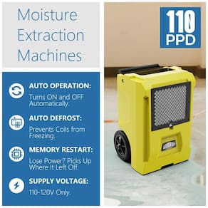 Desumidificador para Espaços Comerciais: Com os seus 110 PPD Pints Per Day a uma capacidade de desumidificação de 150 CFM Pés Cúbicos por Minuto, este desumidificador abrange grandes áreas como caves, zéns industriais, ginásios, garagens, lavandarias, oficinas, bibliotecas, canteiros de obras, ou qualquer espaço que necessite de controle de umidade para a funcionalidade do equipamento e zenamento do produto.