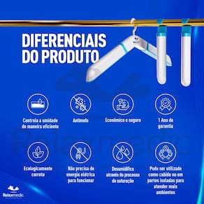 É uma verdadeira inovação em formato de cabide, perfeito para o seu guarda-roupas! O desumidificador também pode ser desmontado para que as partes isoladas sejam utilizadas em lugares menores. Dessa maneira, você desumidifica mais de um local ao mesmo tempo. É possível até mesmo colocá-lo dentro dos calçados!