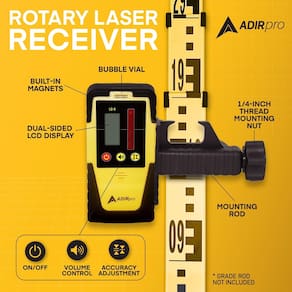 - ?? MELHOR PRECISÃO: O detector rotativo a laser AdirPro possui um alcance de funcionamento de 600 cm (dependendo do laser). Com uma precisão de ± 1/16 polegadas (1 mm) e ± 1/8 polegadas (2,5 mm), ele direciona facilmente o usuário para posicionar o laser mais alto ou mais baixo em uma haste de grau. Isso garante uma leitura precisa o tempo todo.