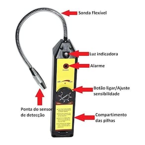 Detector de fuga de gás de ar condicionado. Detecta todos os tipos de gases halogenados; Inclusive R134 LED tricolor indicador de vazamento e pilha fraca; Sensibilidade máxima: 6gr/ano; Alimentação: 4 pilhas de 1,5V AC. Sensibilidade ajustável: Automatica ou manual Resolução: 50ppm Tempo de resposta: Instantâneo Tempo de reajuste: 2 a 10 segundos Tempo de aquecimento: 6 segundos Comprimento do sensor: 200mm Ciclo de trabalho: Contínuo Indicação: - Sonora - Visual - Pilha fraca Temperatura de operação: 0ºC a 52ºC Dimensões: 229 x 65 x 65mm Peso: 250g Acompanha: Estojo e manual de instruções Marca: DM Ferramentas