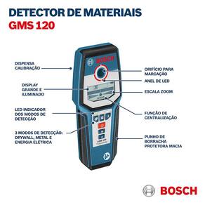 O detector de materiais Bosch GMS 120 é ideal para detecção de metais e paredes, madeira e drywall. Conta com 3 modos de detecção e calibração automática. Confira!