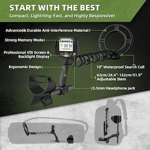 -?LCD retroiluminado de grandes dimensões e configuração dos anos 30?Projetado por especialistas para iniciantes, o painel de controle possui um grande LCD retroiluminado (50% maior que o padrão), botões fáceis de ler e iluminação LED opcional para condições de pouca luz. A alça ergonômica revestida de silicone garante conforto, com operação com uma mão e montagem rápida. A haste telescópica do detector de metais oro y plata se retrai para baixo para facilitar a embalagem em menos de 30 anos.