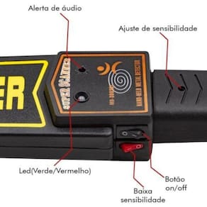 Acompanha 1 detector de metal, 1 bateria recarregável e 1 carregador.