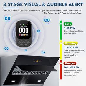- ?Alarme acústico e visual de 3 estágios?O alarme de monóxido de carbono plug-in apresenta uma indicação de ícone de 3 estágios com base na concentração de CO no ar. 0 ~ 50 PPM (verde = seguro), 51 ~ 200 PPM (amarelo = aviso), 201 ~ 999PPM (vermelho = perigoso). O alarme de CO padrão é um alarme audível de 85 dB quando a concentração de CO atinge 51 PPM. Pressione o botão "D" para ligar ou desligar a campainha (alarme sonoro).